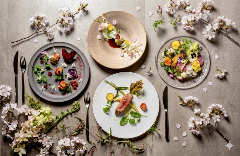窓の外に広がる景色とともに、大切なゲストの方をおもてなしするお料理を春限定メニューでご堪能いただけます♪ 季節の食材や旬の食材をふんだんに取り入れた「SHIKISAI」をテーマにした見た目にも華やかな至福の一品をお楽しみください🌸